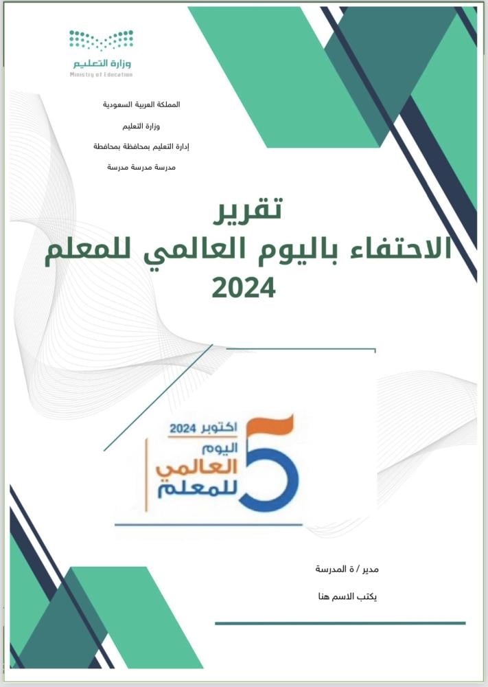 تقرير مصور شامل لفعاليات الاحتفاء باليوم العالمي للمعلم 2024. قالب منسق جاهز قابل للتعديل بما يتناسب مع متطلبات المدرسة
