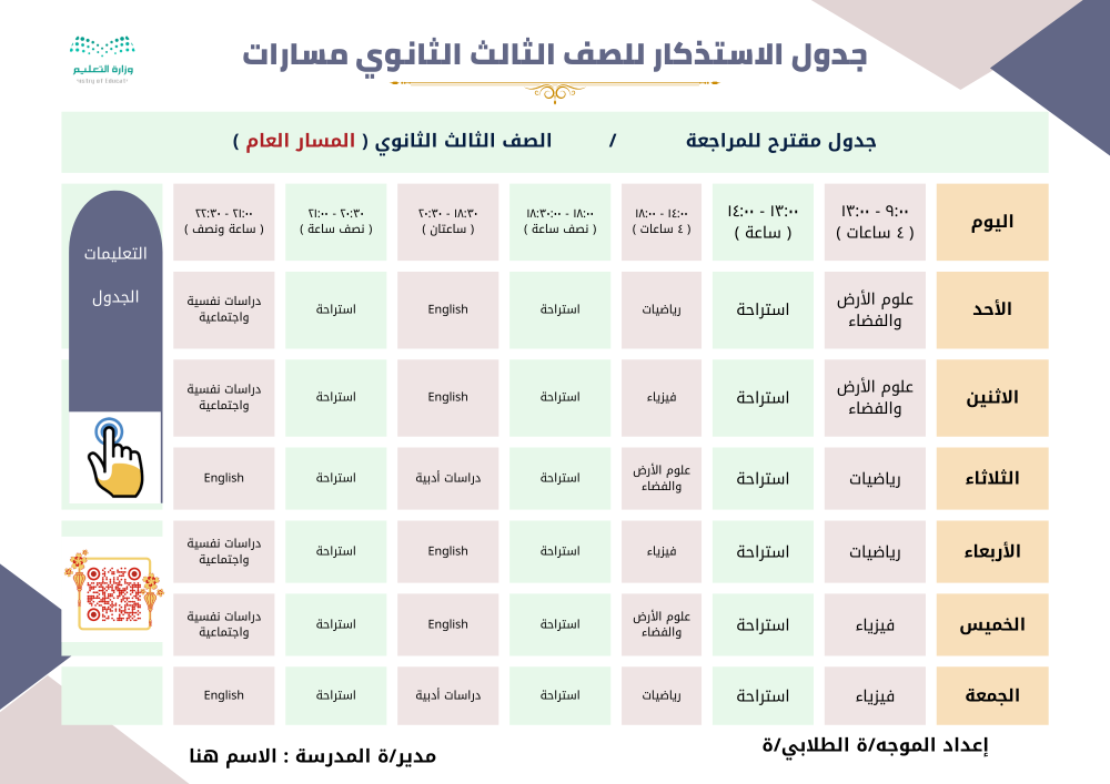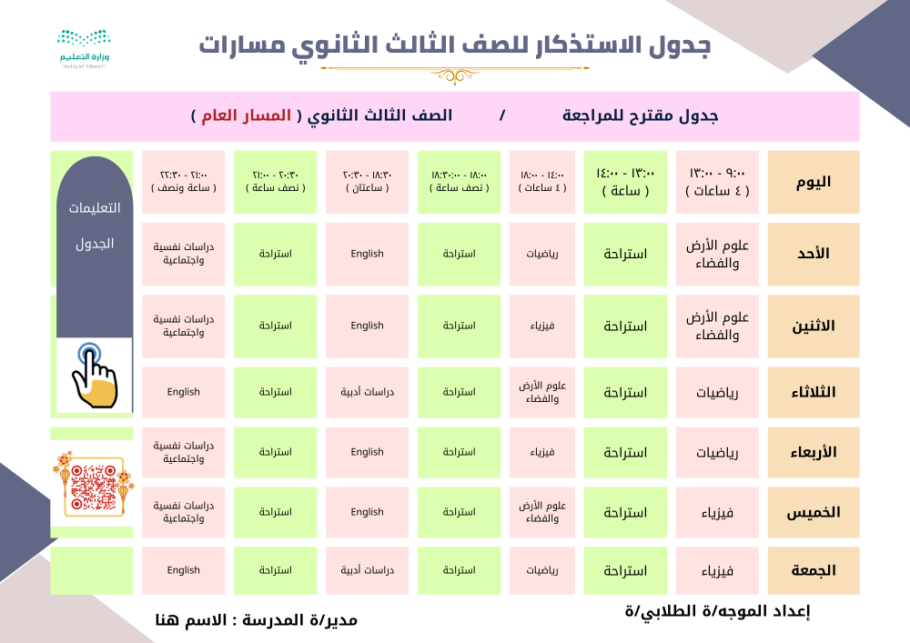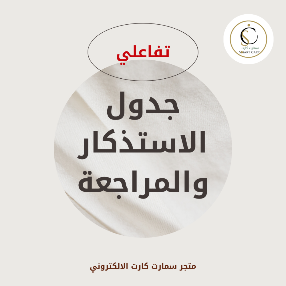 جدول الاستذكار التفاعلي لجميع المراحل الدراسيةجدول استذكار ومراجعة مقترح لمدة أسبوعإضافة المواد الدراسية المتوافقة مع المرحلة الدراسيةمرفق في الجدول باركود وايقونة تفاعلية قابلة لإضافة ( تعليمات الاخت...